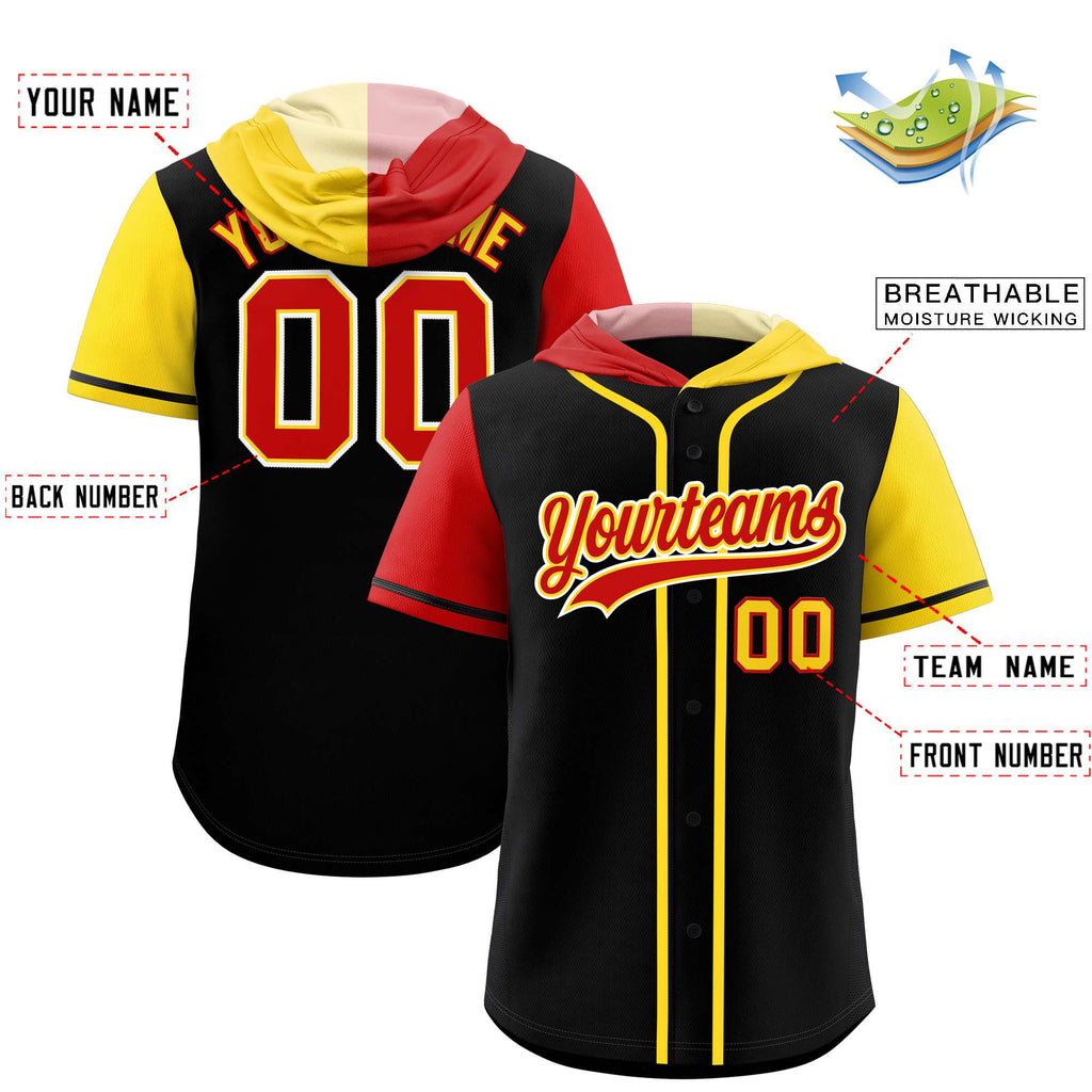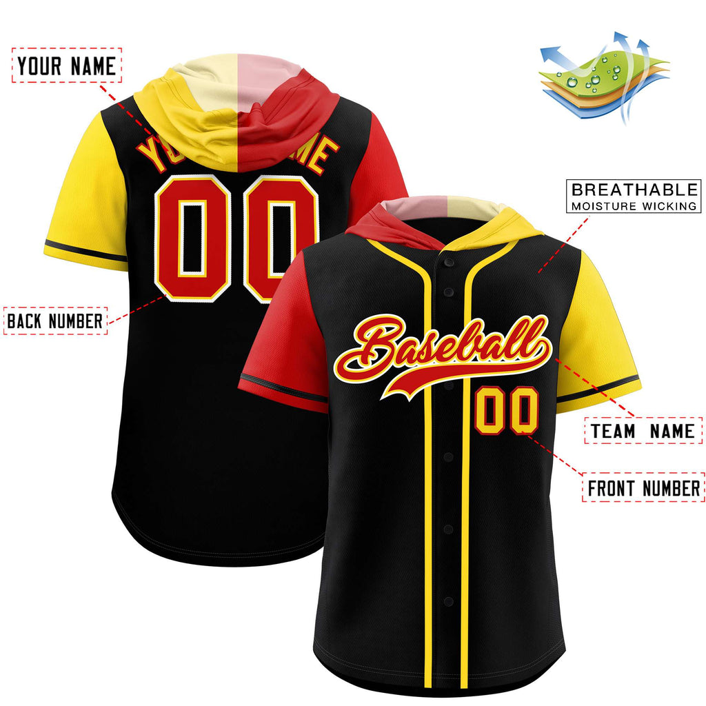 Custom Black Red and Gold Split Fashion Raglan Sleeves Authentic Baseball Hoodie Jersey