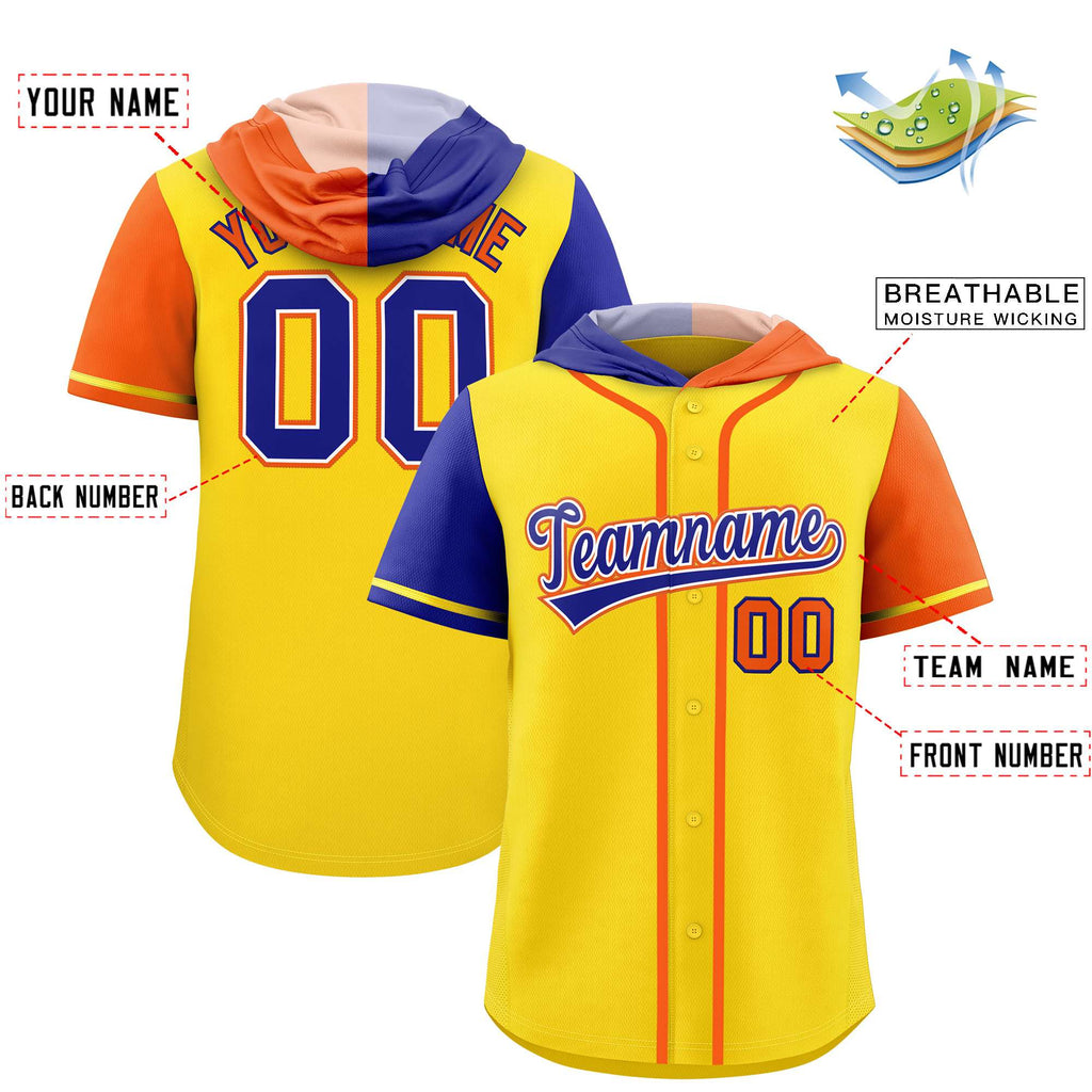 Custom Gold Royal and Orange Split Fashion Raglan Sleeves Authentic Baseball Hoodie Jersey