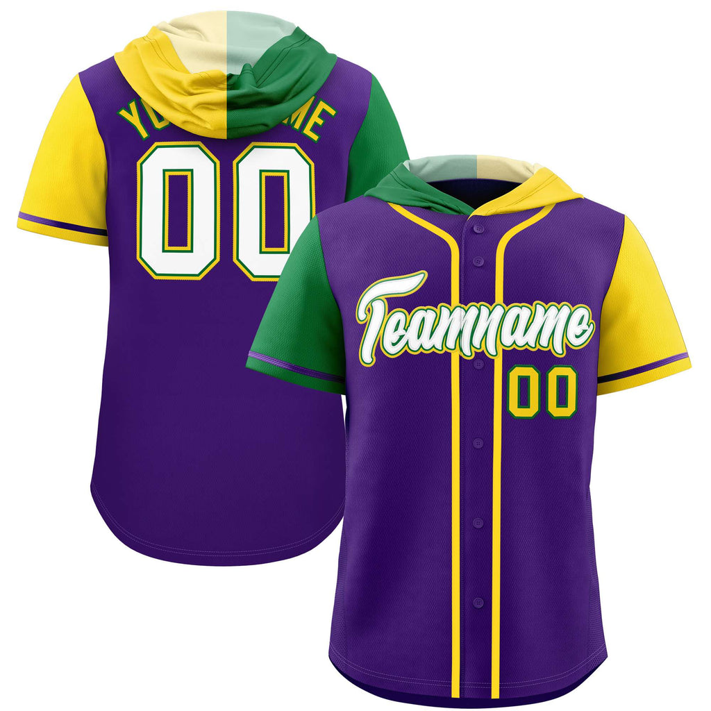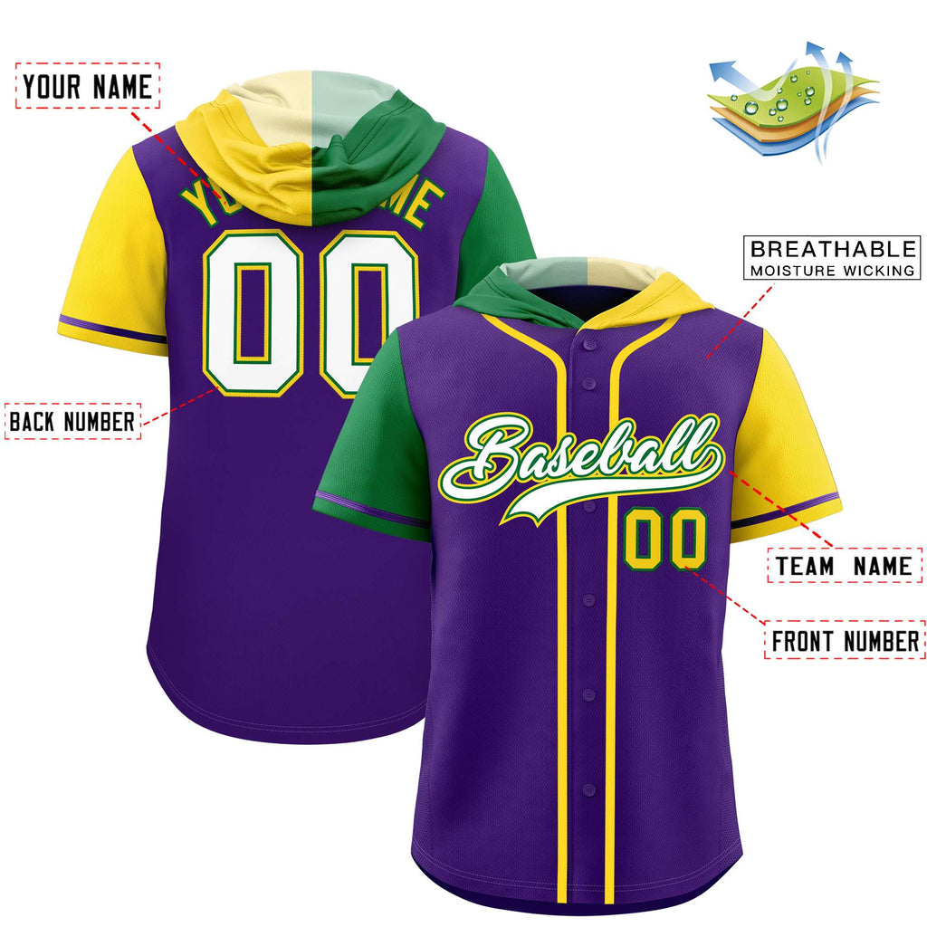 Custom Purple Kelly Green and Gold Split Fashion Raglan Sleeves Authentic Baseball Hoodie Jersey