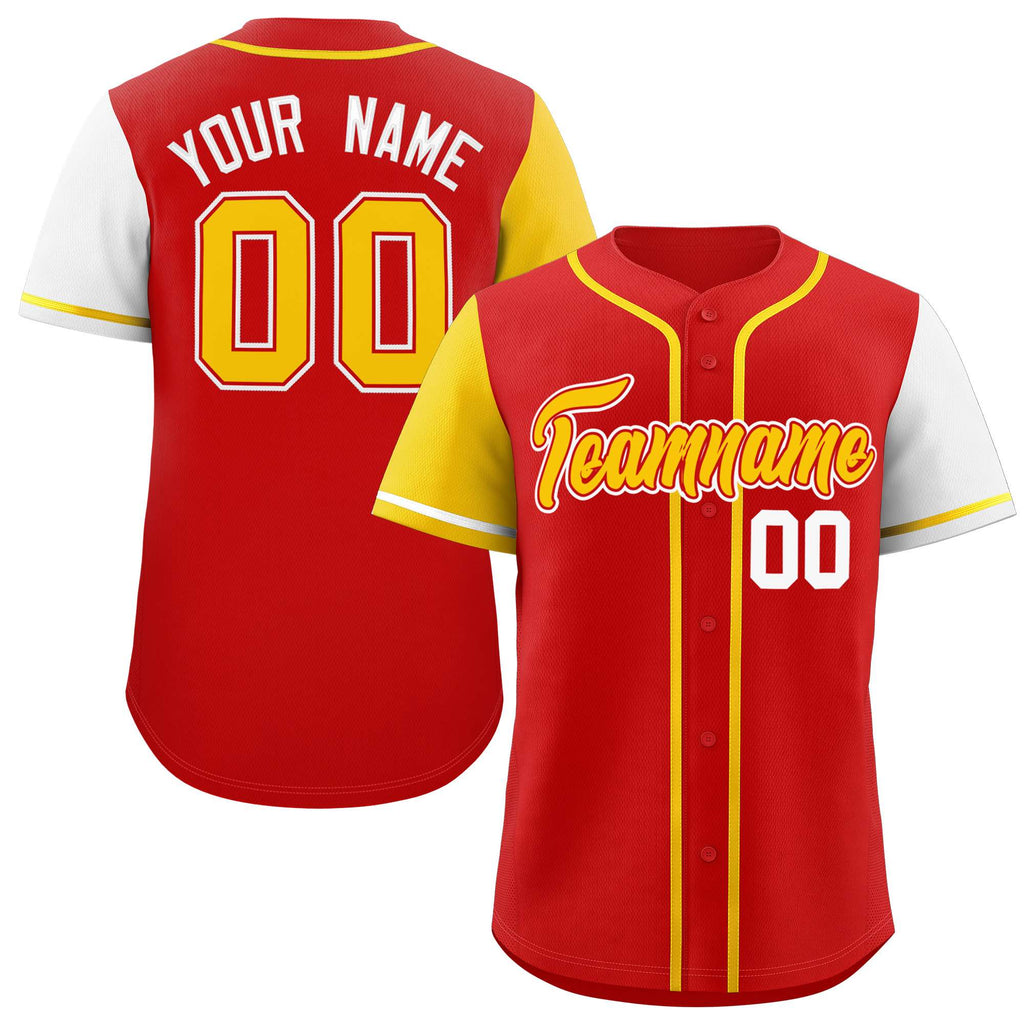 Custom Red Gold and White Raglan Sleeves Authentic Baseball Jersey
