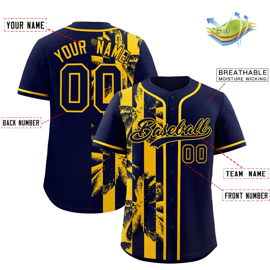 Custom Navy Yellow Split Fashion Coconut Tree Design Authentic Baseball Jersey