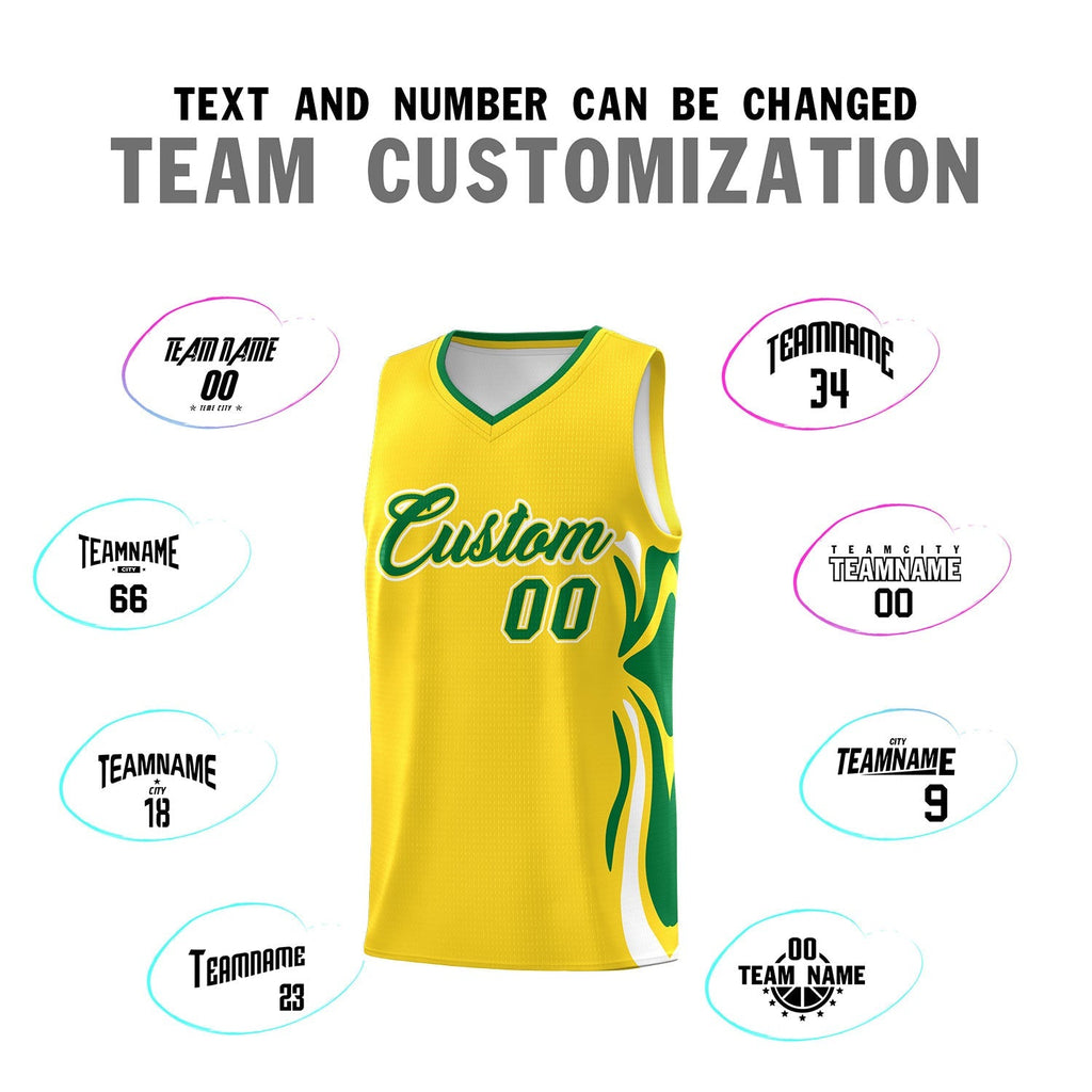 Custom Gold Kelly Green-White Graffiti Pattern Side Curve Pattern Sports Uniform Basketball Jersey Sets