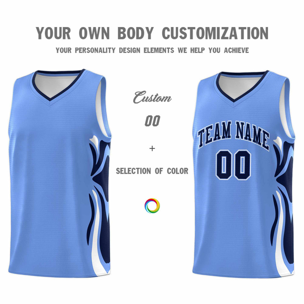 Custom Light Blue Navy-White Graffiti Pattern Side Curve Pattern Sports Uniform Basketball Jersey Sets