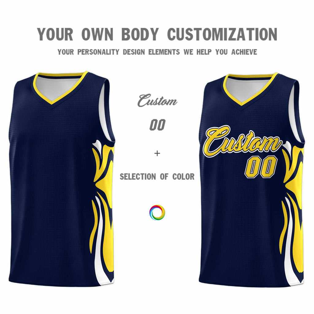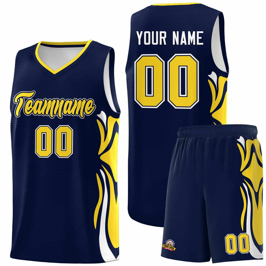 Custom Navy Gold-White Graffiti Pattern Side Curve Pattern Sports Uniform Basketball Jersey Sets