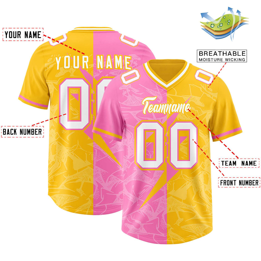 Custom Yellow Pink Split Personalized Lightning Pattern Football Jersey