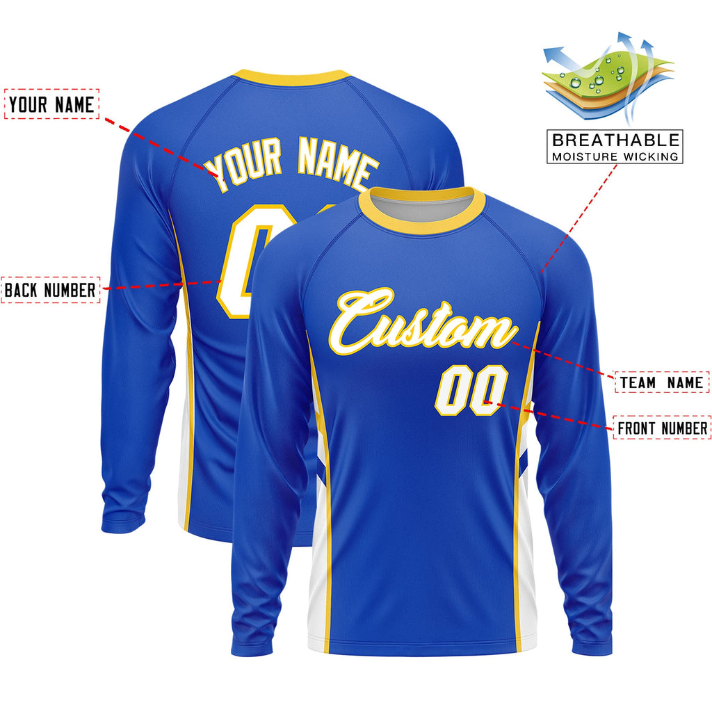 Custom Royal White Crew Neck Personalized Raglan Long Sleeve Performance T-Shirt