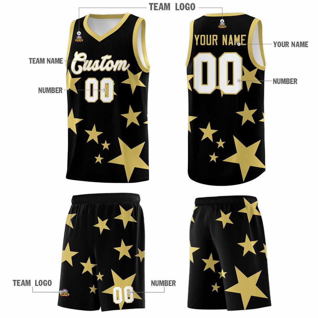 Custom Black Old Gold Graffiti Pattern Star Print Basketball Jersey Sets