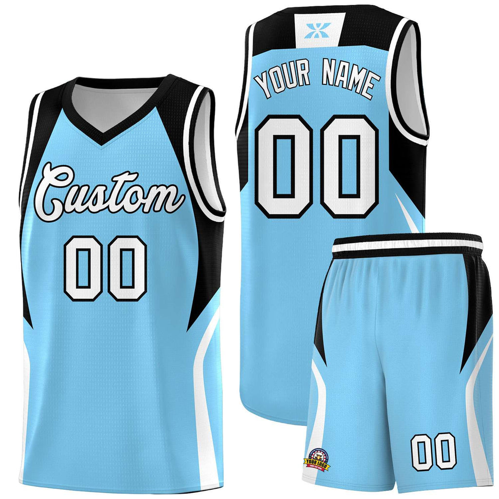 Custom Light Blue Black and White Color Block Sports Uniform Basketball Jersey