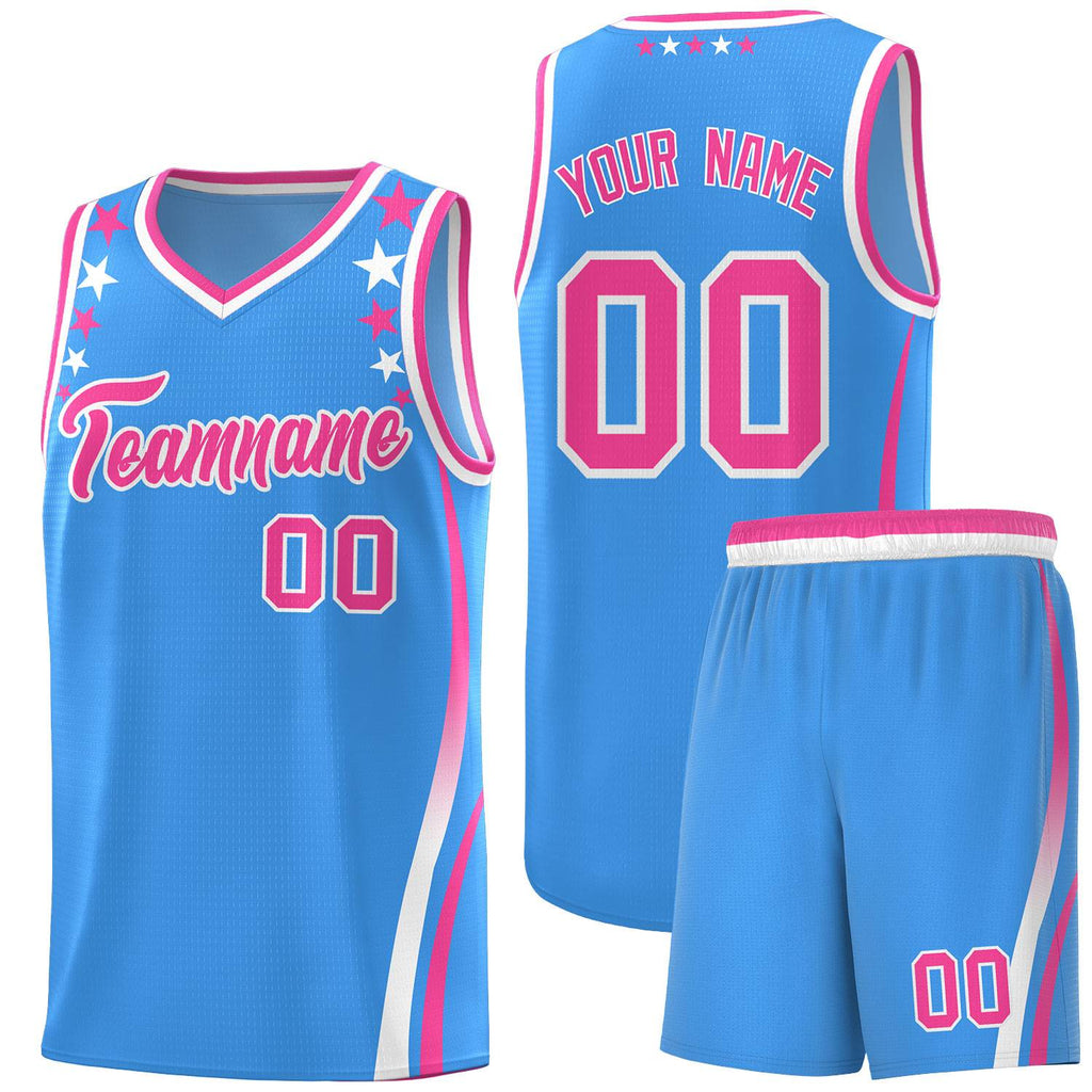 Custom Light Blue Shoulders Star Pattern Side Color Block Sports Uniform Basketball Jersey