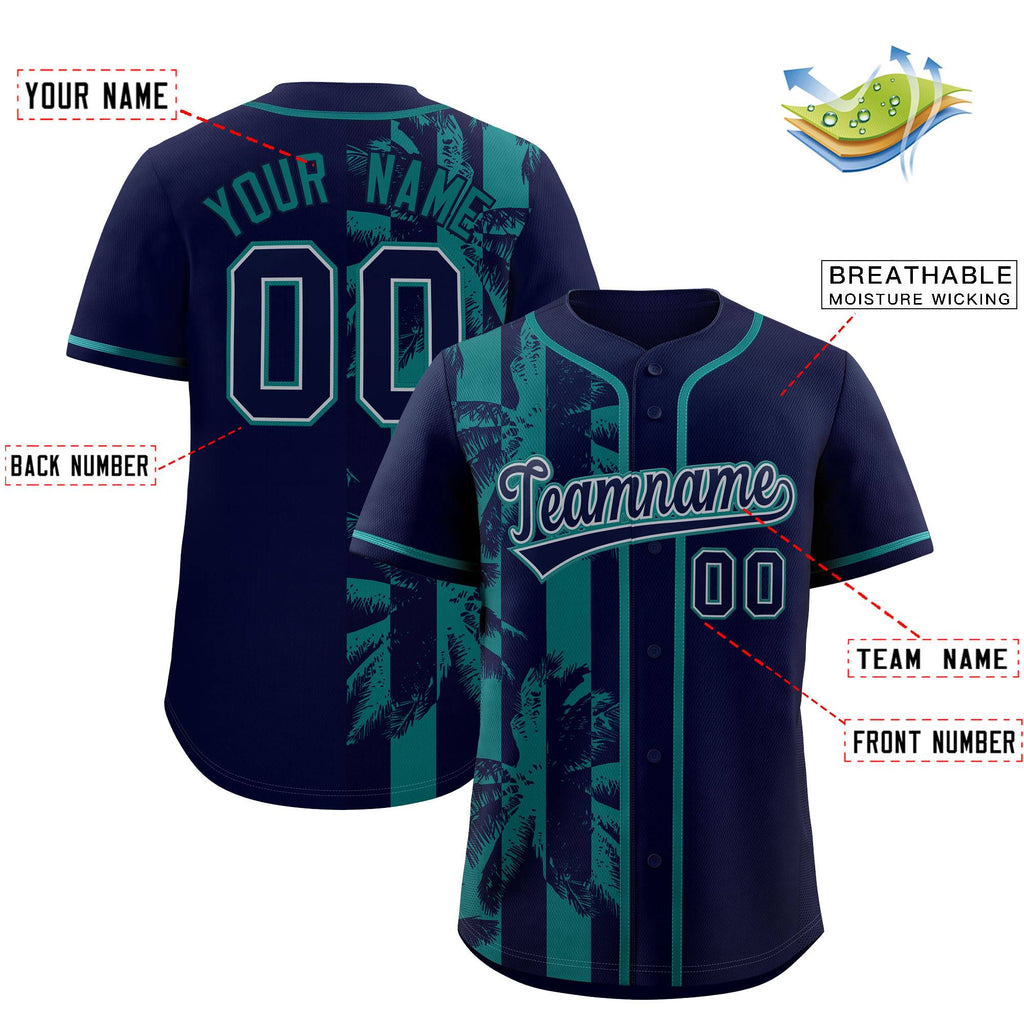 Custom Navy Aqua Split Fashion Coconut Tree Design Authentic Baseball Jersey