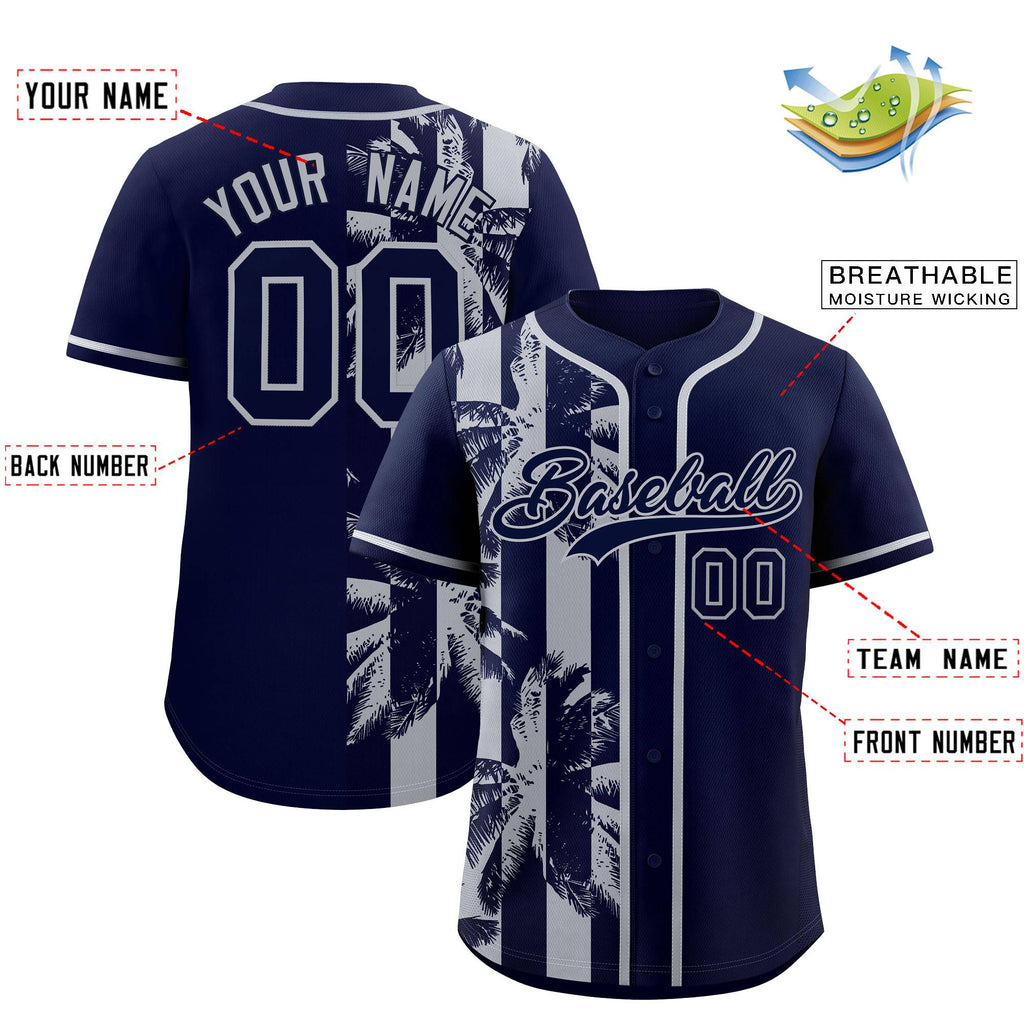Custom Navy Gray Split Fashion Coconut Tree Design Authentic Baseball Jersey