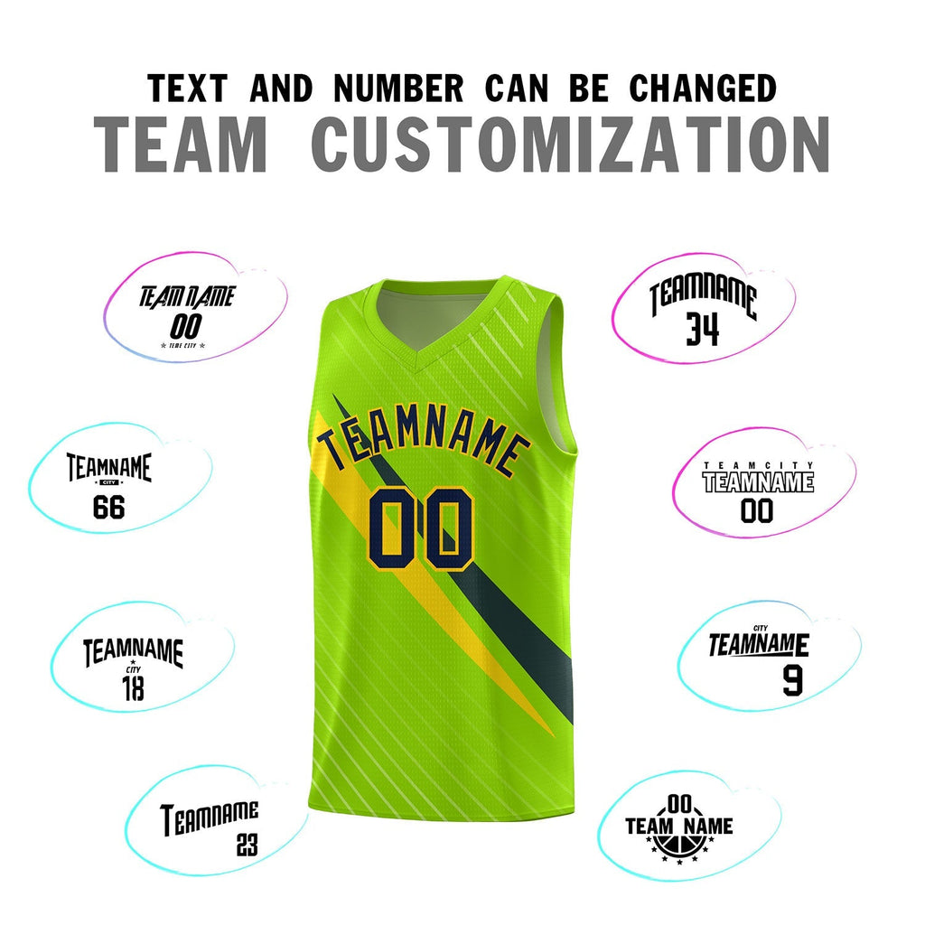 Custom Neon Green Diagonal Pinstripe Pattern Color Block Sports Uniform Basketball Jersey