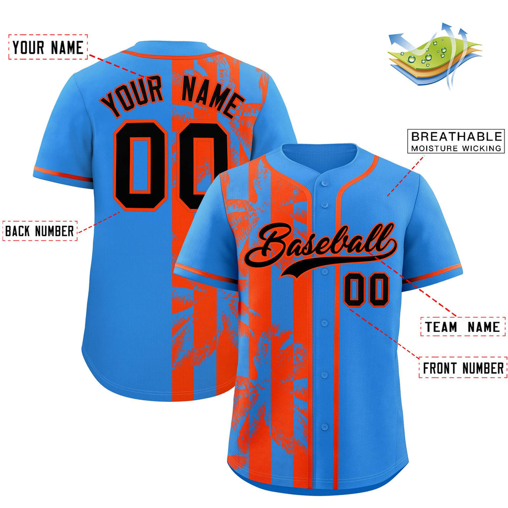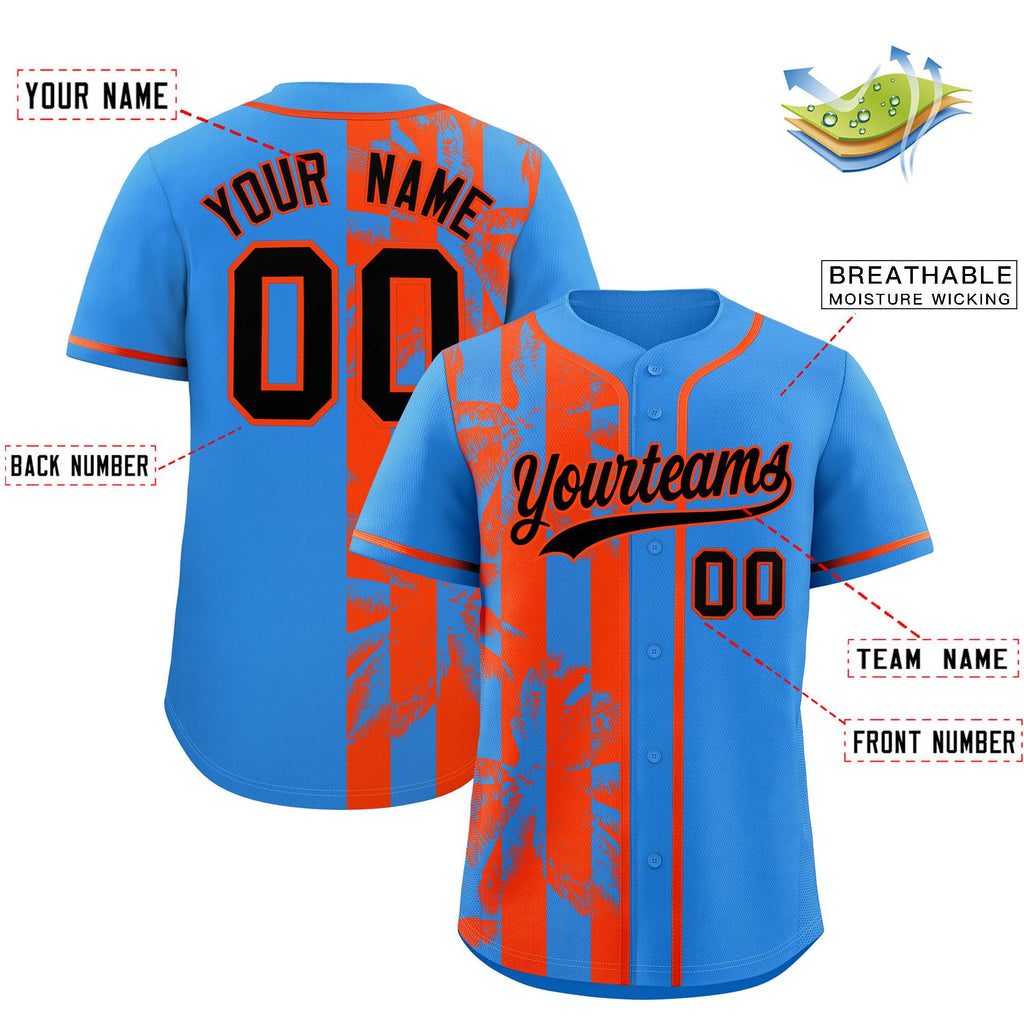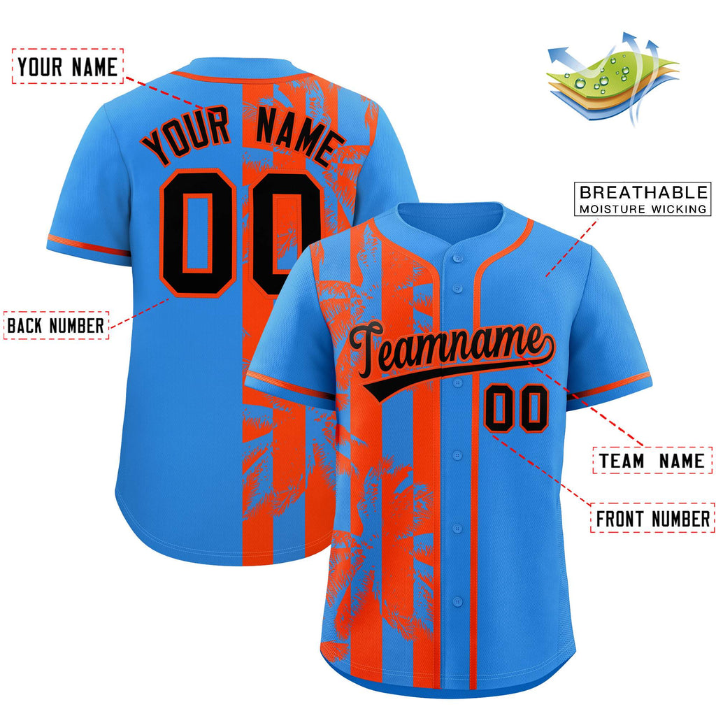 Custom Powder Blue Orange Split Fashion Coconut Tree Design Authentic Baseball Jersey