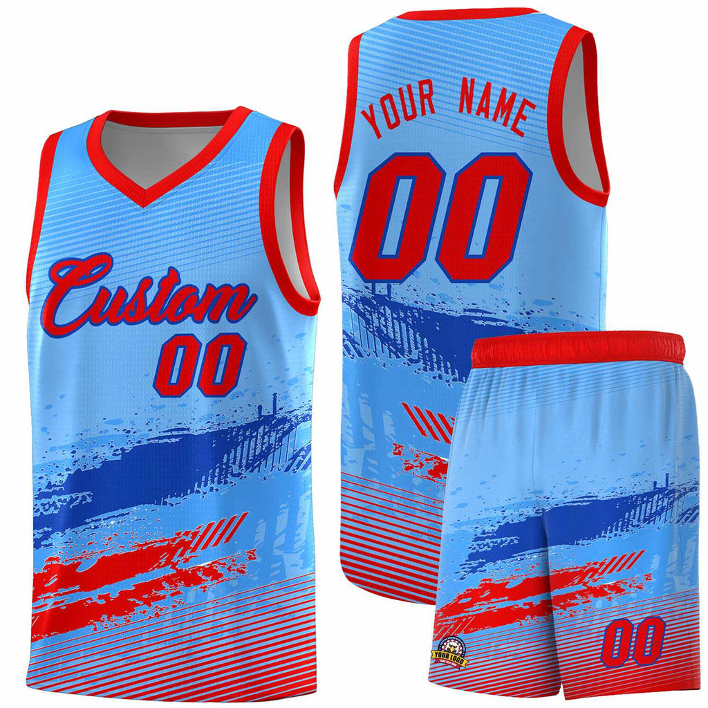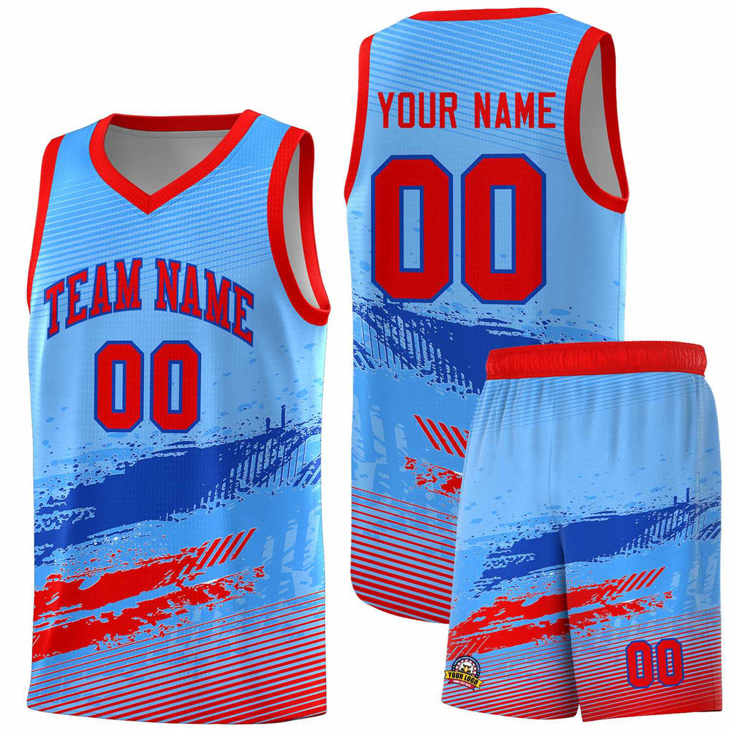Custom Powder Blue Royal and Red Graffiti Pattern Sports Uniform Basketball Jersey