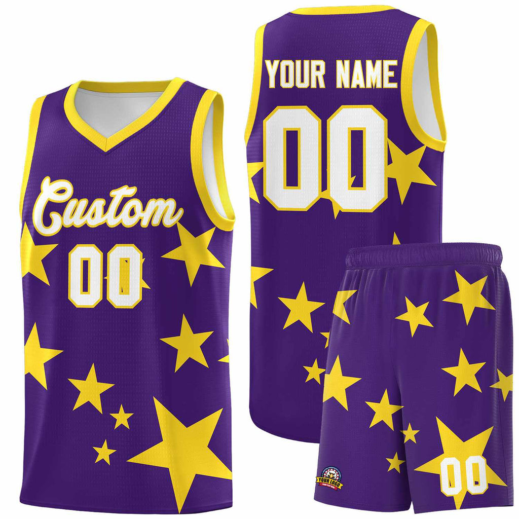 Custom Purple Gold Graffiti Pattern Star Print Basketball Jersey Sets