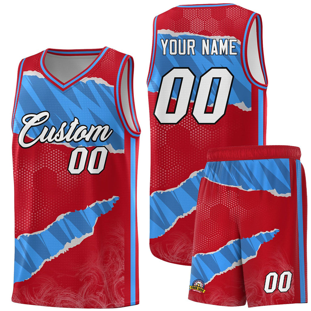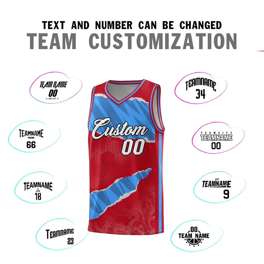 Custom Red Light Blue-Navy Tear Graffiti Pattern Sports Uniform Basketball Jersey