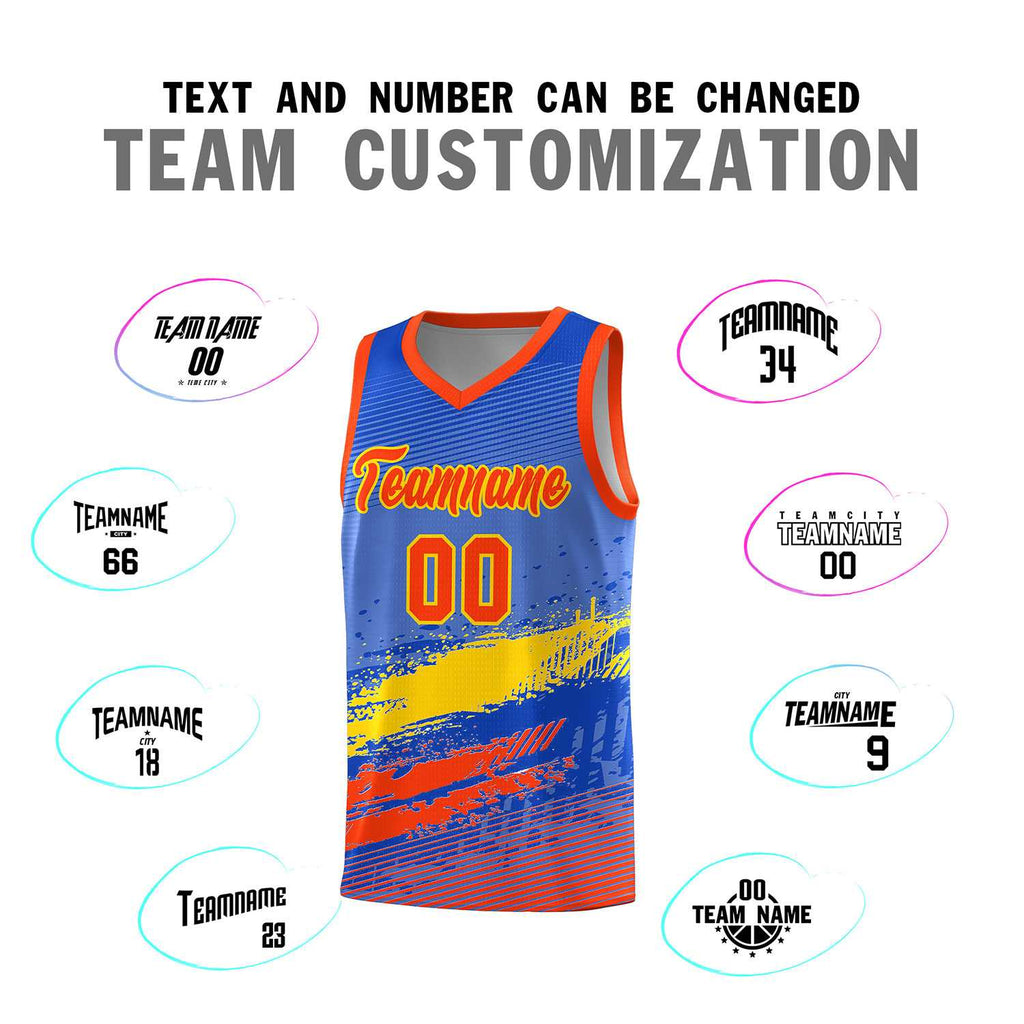Custom Royal Gold and Orange Graffiti Pattern Sports Uniform Basketball Jersey