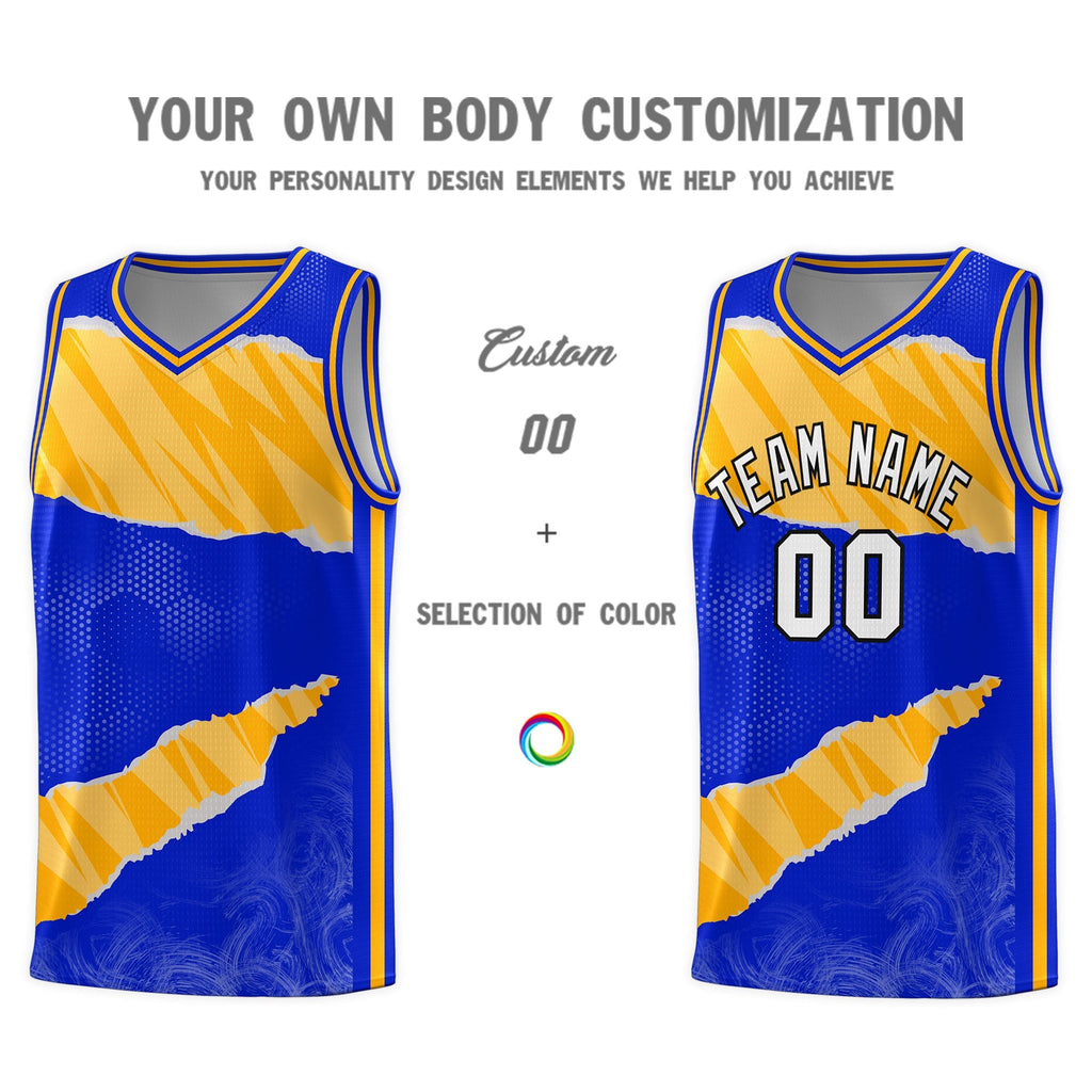 Custom Royal Gold-White Tear Graffiti Pattern Sports Uniform Basketball Jersey