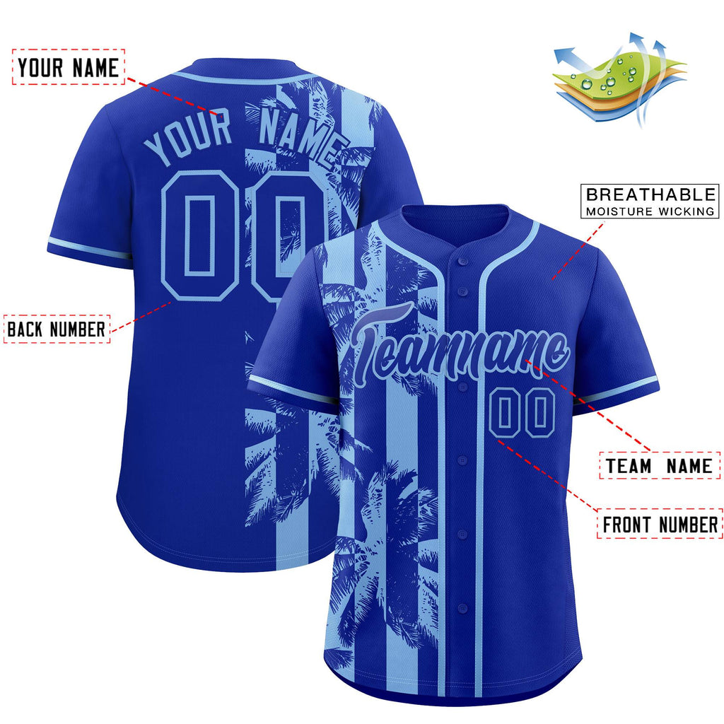 Custom Royal Powder Blue Split Fashion Coconut Tree Design Authentic Baseball Jersey