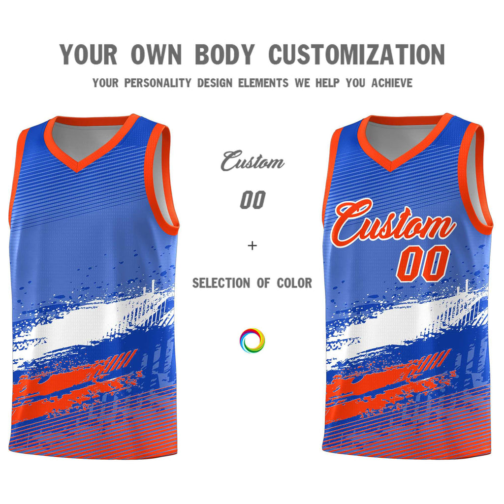 Custom Royal White and Orange Graffiti Pattern Sports Uniform Basketball Jersey