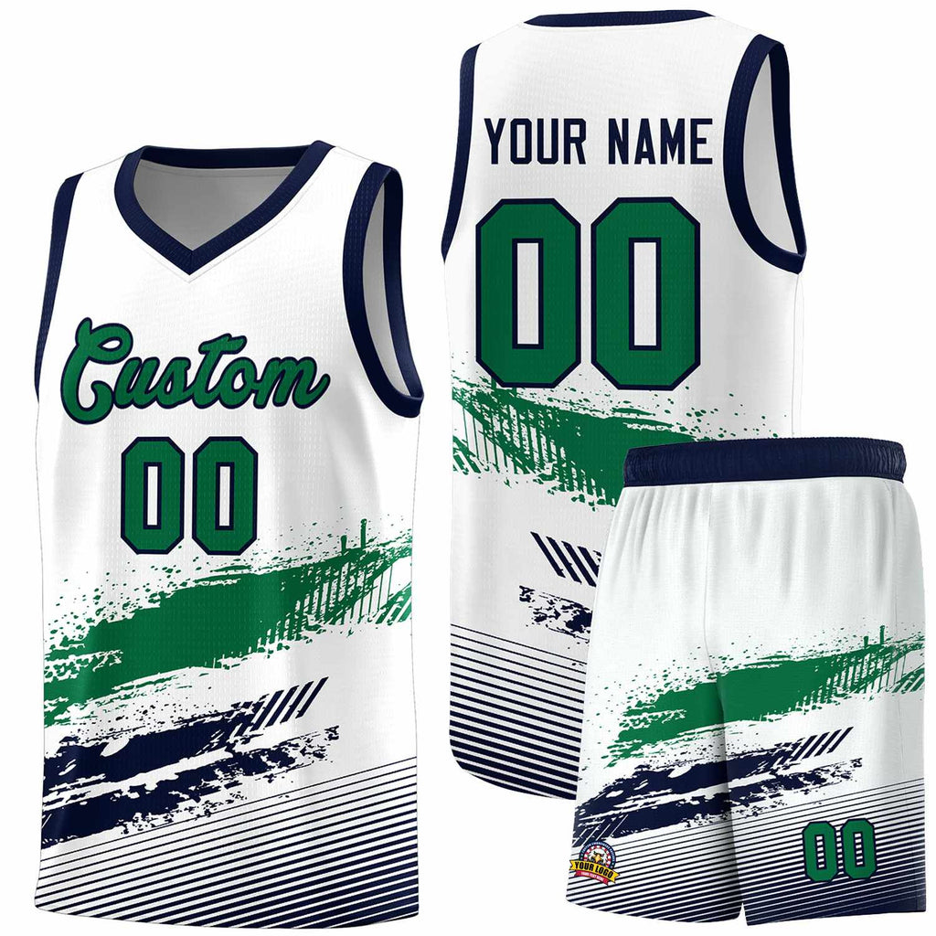 Custom White Kelly Green and Navy Graffiti Pattern Sports Uniform Basketball Jersey