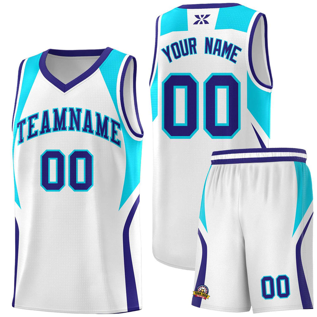 Custom White Sky Blue and Royal Color Block Sports Uniform Basketball Jersey